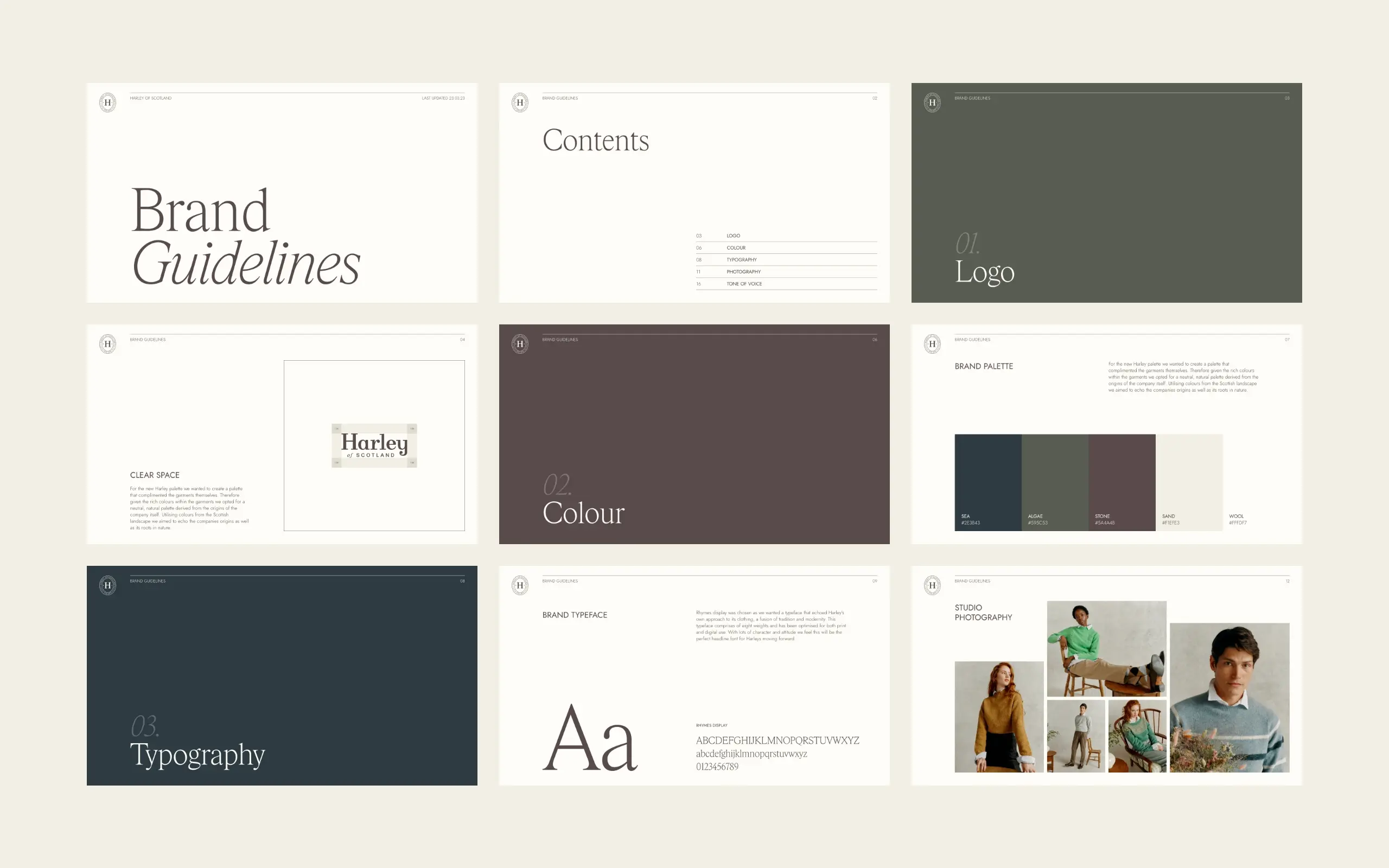The new colour palette reflects the rich hues of the Northern Isles’ distinctive landscape, using carefully selected natural tones that would perfectly complement Harley’s beautiful knitwear. With an existing typeface that needed revitalisation, we sought typography that would blend modernity with tradition, echoing the company’s unique offering of contemporary garments created using historical methods. We settled on Rhymes Display, a serif font that would revive the brand’s marketing through a more type-driven aesthetic whilst sustaining the traditional allure so central to the brand’s identity.