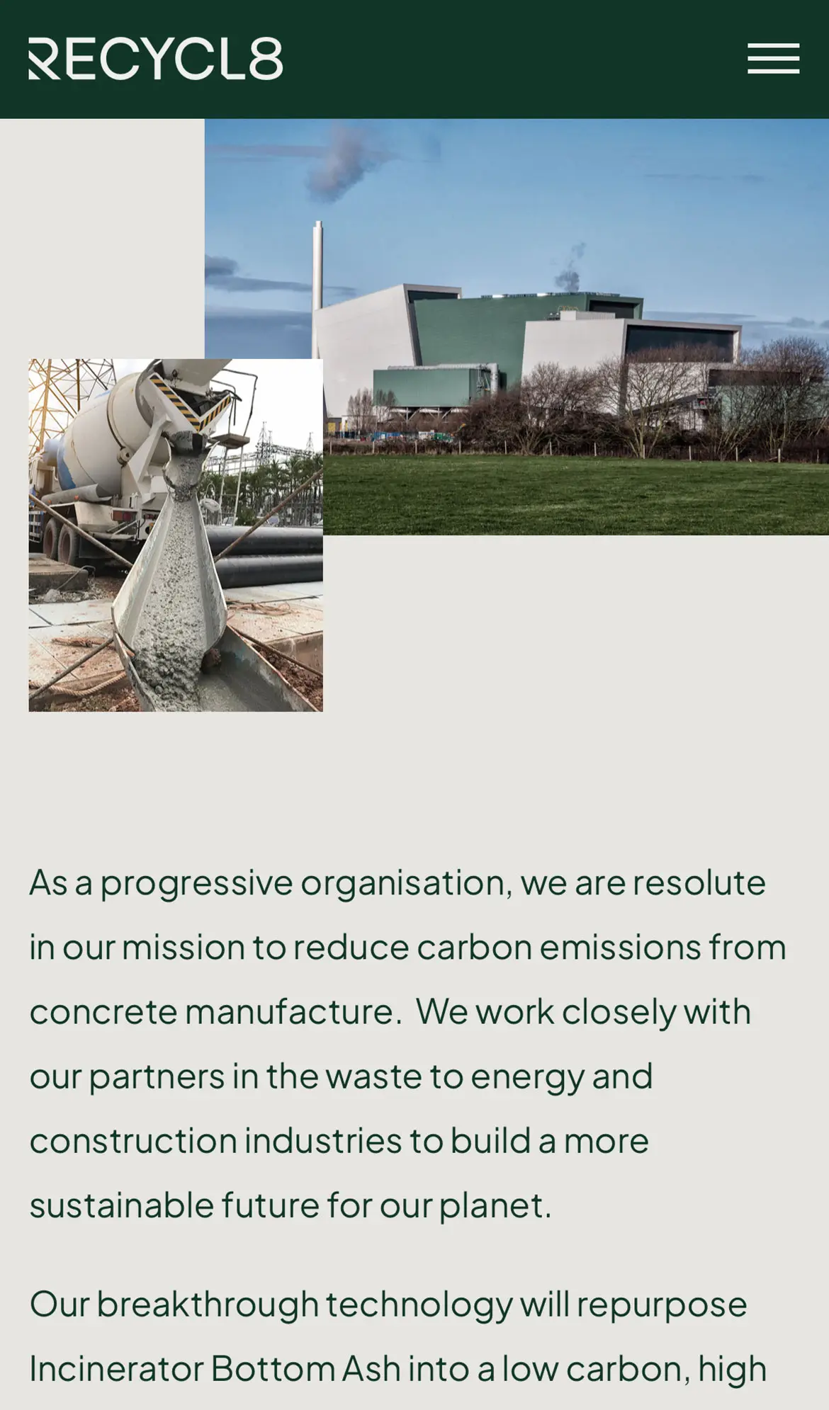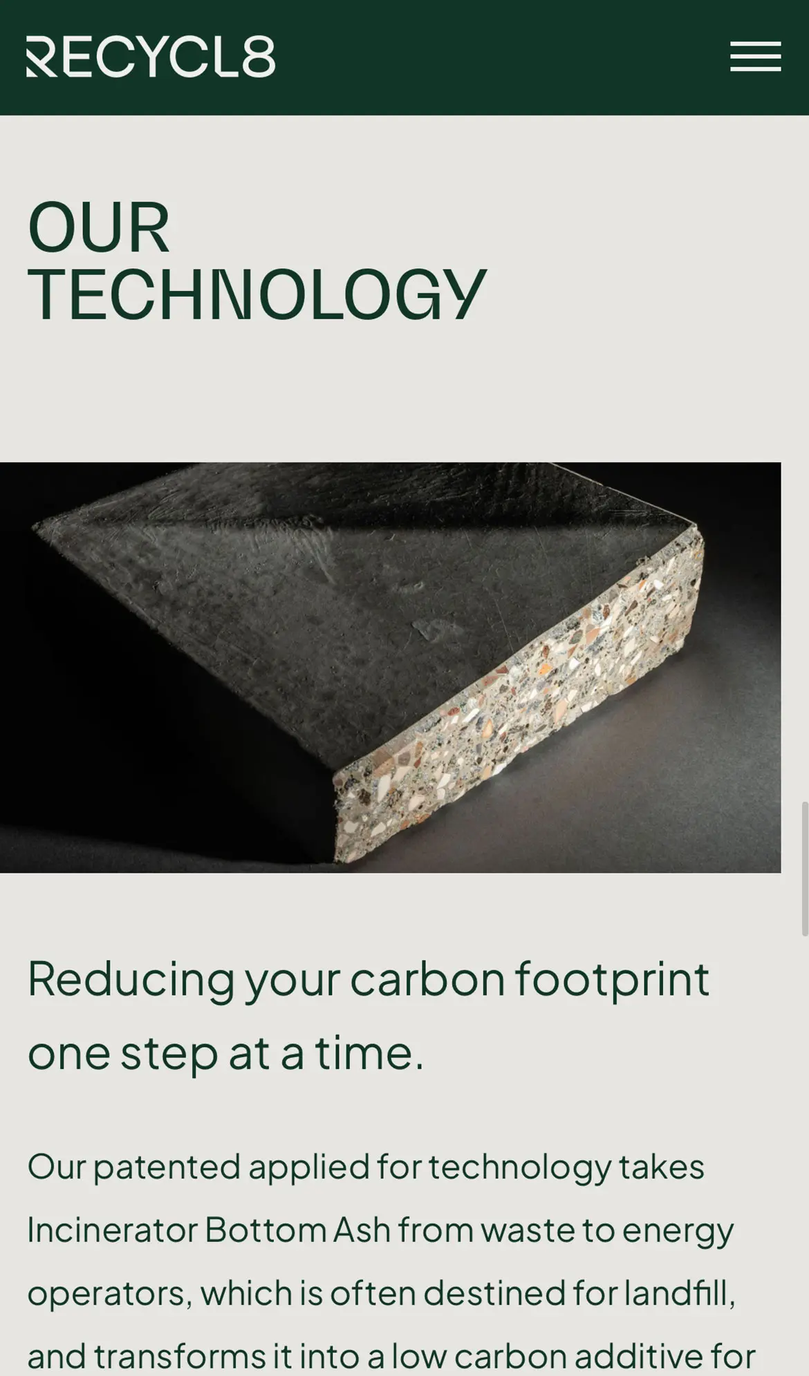 The final stage in the rebrand process was to work with the team on their digital presence. Given that the product was still in the testing phase they wanted a website that would showcase their mission as a company as well as explain the process to potential customers. Many other companies had claimed to be doing what they were doing but Recycl8 wanted to showcase that their process was truly sustainable.