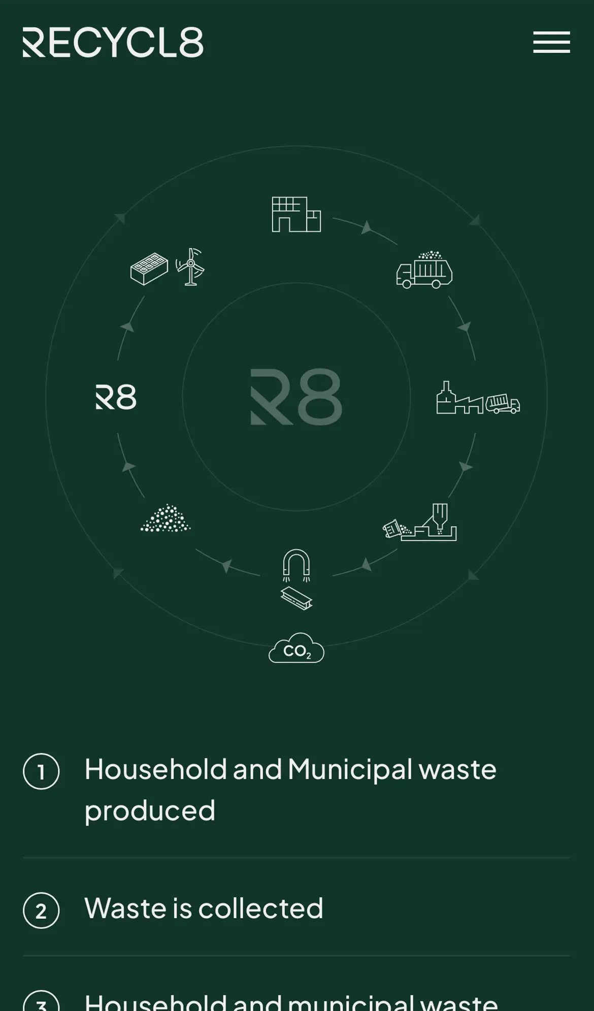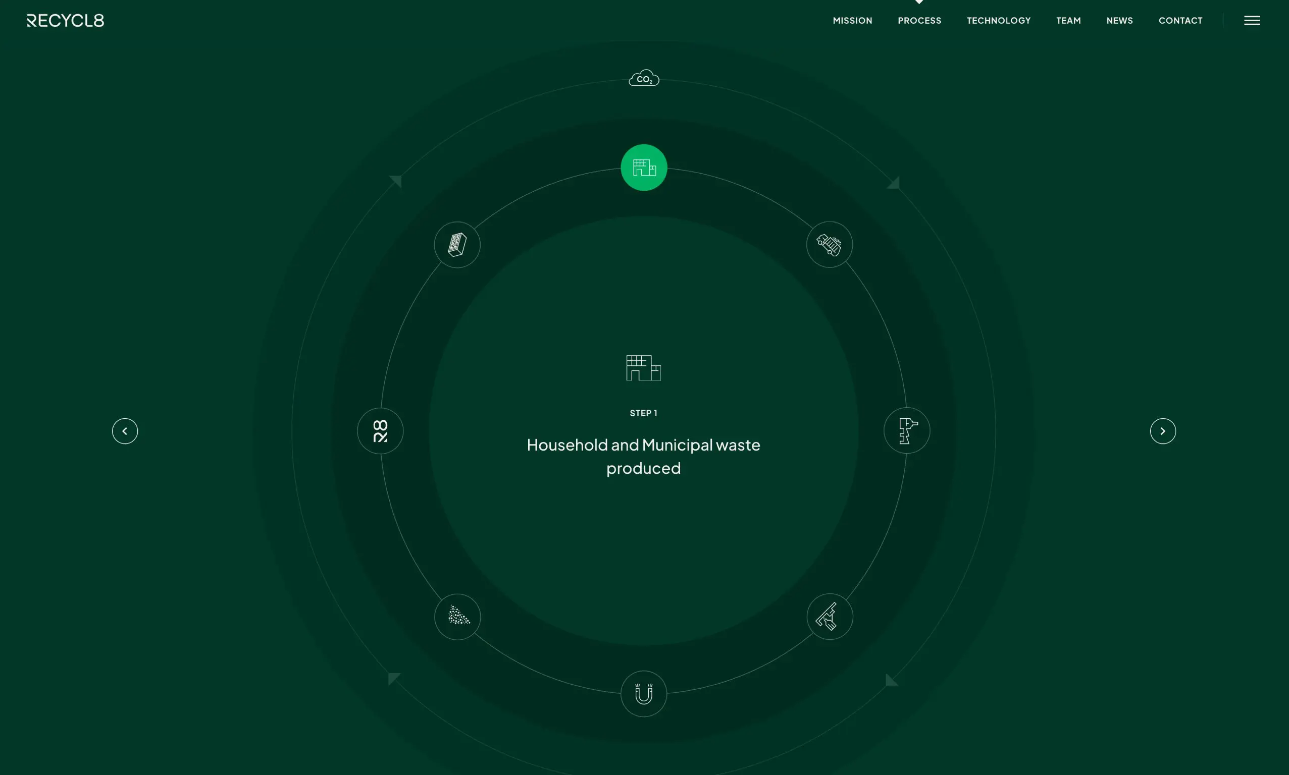 A key part of the new website would be the ability to explain how the process works from the collection of waste material to the final product. Therefore, we worked with the team to create an interactive process wheel which showcased the 8 key stages in their process.